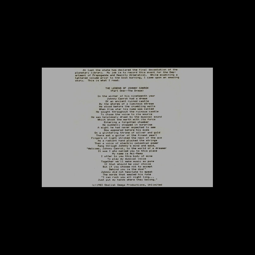Meanwhile we entered the rat race which is the L.A. rock scene. At first we rented rehearsal space until we had turned that garage into a studio. We started out doing Rush covers and a bunch of other material, and ended up doing pretty much all original music, some of which I wrote or helped write. (Like many of the bands we were into e.g. Rush, Pink Floyd, Led Zeppelin etc, in my youth I was into reading the science fiction and fantasy genre so there were elements of that in my lyric writing). We played all kinds of weird gigs, mainly clubs in L.A. and Hollywood, including Madame Wong's (West, and downtown); Club 88; the Music Machine; the Troubadour; various "battles of the bands" at clubs like Gazzari's on Sunset; and all kinds of parties at our pad (where we had given the garage the name of "The Fabulous Omega Room," after our "record label" or "publishing company" or whatever it was, namely, "Obelisk Omega Records" (I think we just liked the logo because of its very subtle sexual overtones).